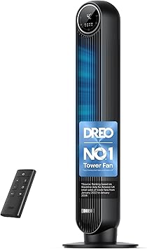 Powerful Meets Portable: Dreo's all-in-one airflow system combines with a supercharged electric motor, delivering high-speed, refreshing winds. This 36-inch compact tower fan enlivens every inch of air in your living space fast at up to 28ft/s. · Cut Out the Noise: Enjoy all-day serenity and comfort, enabled by its algorithmic impeller design and the magical Conada effect. Along with display auto off, auto mute in Sleep mode, 8h timer, and soothing airflow, you can always get a restful sleep whenever you need it. · Easy to Clean and Safe to Use: Removable rear grille and impeller wheel make cleaning more accessible. Designed with fingertip pinch-proof grills, a fused plug and built-in circuit protection, this CE-listed standing fan ensures safety is always prioritized. · Far and Vast: 90° oscillation and calibrated airflow path allow this oscillating fan to cover more areas in the room. Combine with your air conditioners for cost-effective comfort during hot days. · Customizable Comfort: Featured with 4 modes (Normal/Natural/Sleep/Auto) and 8 speeds from soothing-soft to storm-strong, you can easily customize your comfort at the touch of a button, on the panel or the remote.